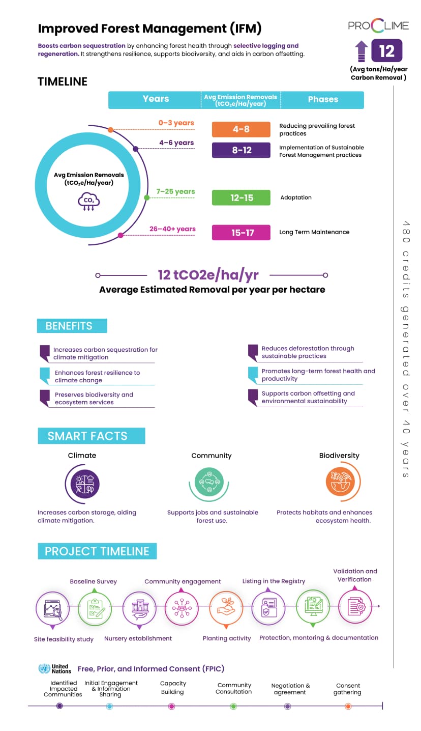 Improved Forest Management (IFM) provides environmental and economic benefits. By enhancing forest health, we boost biodiversity and carbon sequestration, aiding climate change mitigation. Our sustainable approach reduces overexploitation and habitat loss.